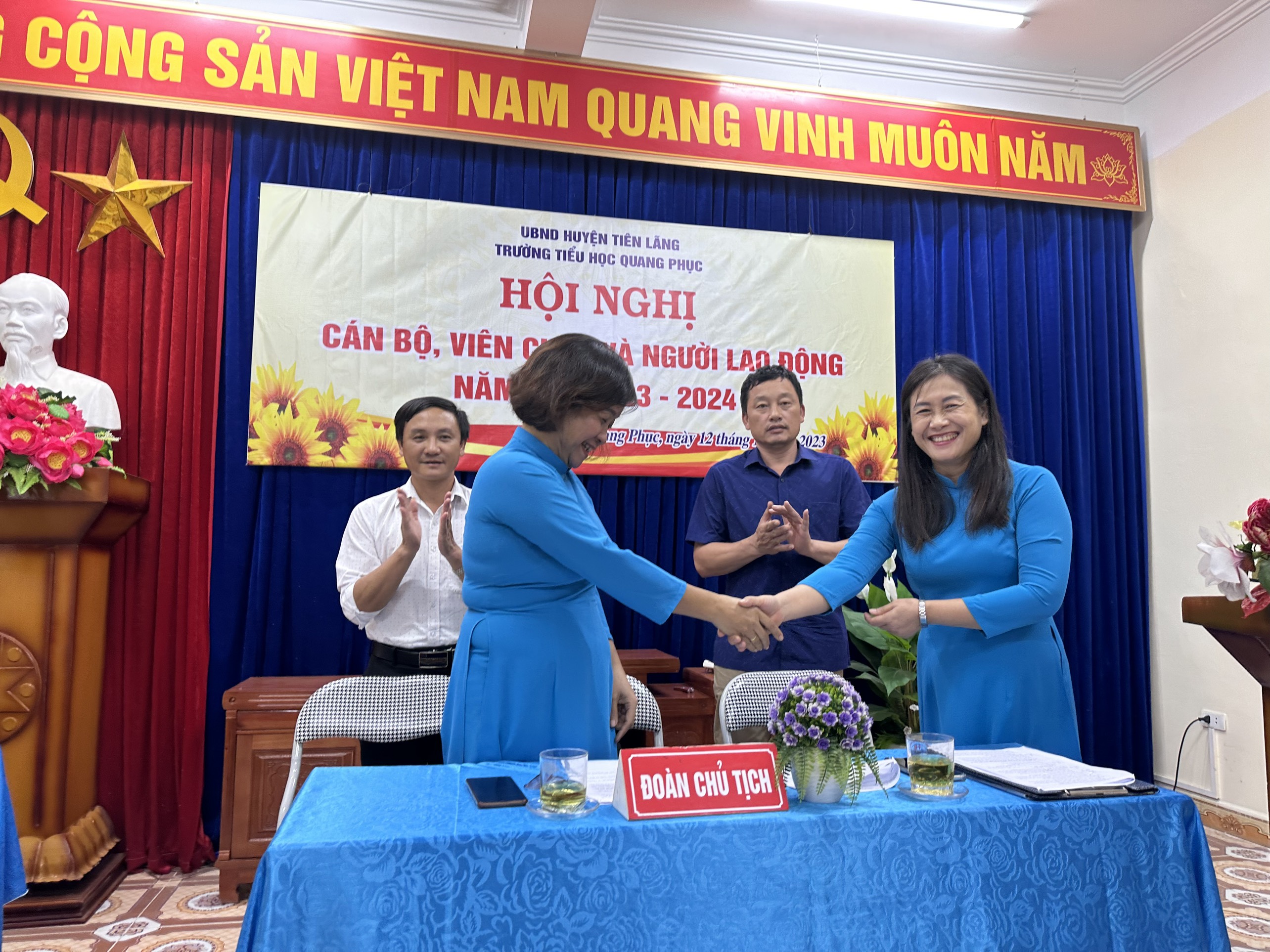 IV. Hội nghị giao cho Ban Giám hiệu và Ban chấp hành Công đoàn tiếp thu ý kiến chỉ đạo của đồng chí Nguyễn Văn Quyết- Phó Chủ tịch UBND xã Quang Phục và các ý phát biểu tham luận; Căn cứ vào Nghị quyết của hội nghị cán bộ, viên chức và người lao động, Nghị quyết của Đảng, chính sách pháp luật của Nhà nước, nhiệm vụ của ngành, địa phương cụ thể hoá thành kế hoạch chương trình hành động và chỉ đạo triển khai thực hiện.